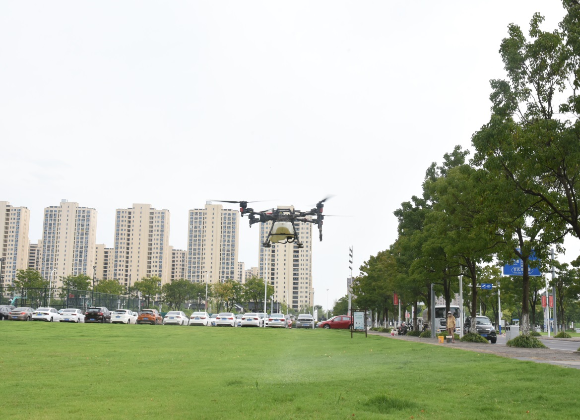 此次為園區(qū)首次采用無人機噴灑農(nóng)藥,在防治前,建發(fā)公司綠化管理人員和路段養(yǎng)護技術(shù)人員多次實地勘探區(qū)域內(nèi)試驗點,結(jié)合人流量等多種因素,最終噴灑農(nóng)藥區(qū)域選擇在中央商務(wù)區(qū)。在專業(yè)技術(shù)人員的操控下,植保無人機按預(yù)設(shè)路線不斷前進,細(xì)密的噴液滴通過霧化器處理后均勻地噴灑在草坪上。不到4小時,一次全面精準(zhǔn)的病害防治工作已經(jīng)高效完成。