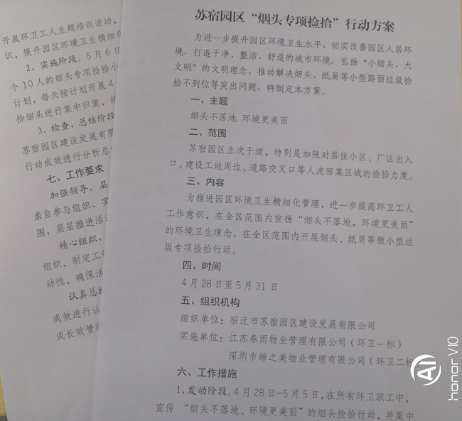 為了確?!盁燁^專(zhuān)項(xiàng)撿拾”行動(dòng)順利開(kāi)展,公司結(jié)合園區(qū)實(shí)際,精心籌劃,制定了《蘇宿園區(qū)“煙頭專(zhuān)項(xiàng)撿拾”行動(dòng)方案》。